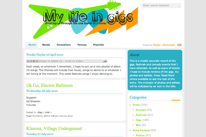 Current - My gig blog, currently active here. CSS coding on Wordpress theme, additional graphics and PHP coding for additional features.