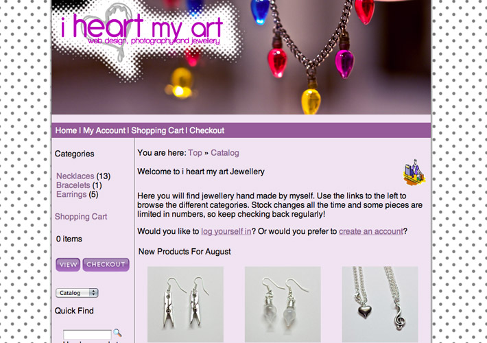 2009 - I heart my art shop front. CSS and HTML coding, with graphics and PHP e-commerce template customisation.